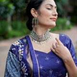 Celebrate tradition and sophistication with this Blue Dola Silk Lehenga Choli, beautifully complemented by a Light Blue Dola Silk blouse. Crafted from premium Dola Silk, the lehenga showcases intricate Bandhej and Ajarakh print work, stitched with canvas and Can-Can for a voluminous 3.8-meter flair.