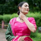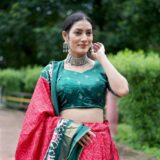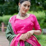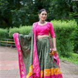 Stand out in this Bottle Green Dola Silk Lehenga Choli, paired with a contrasting Pink blouse. Featuring Bandhej and Ajarakh prints, Gotta Patti lace borders, tassels, and a 3.8-meter flair, perfect for weddings, sangeet, and festive