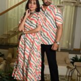 A breezy cotton outfit featuring playful wavy stripes in red and blue on a cream base. The tiered puff-sleeve dress and collared short-sleeve shirt make a stylish pair for outings, brunches, or vacations.