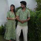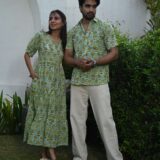 This light green couple matching outfit includes a women?s flowy cotton midi dress and a men?s short-sleeve printed shirt. Designed with cheerful yellow floral prints, this set is perfect for summer outings, casual gatherings, or twinning on vacations.