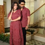 A bold maroon cotton set featuring vertical stripe patterns with dotted ethnic detailing. The button-down dress with 3/4 sleeves and collared shirt create a perfectly coordinated casual yet festive outfit for couples.