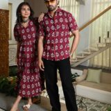 This Maroon matching outfit set includes a women?s midi dress and a men?s short-sleeve shirt, both featuring vibrant red ethnic prints. Perfect for couples who love twinning in style at casual outings, festive gatherings, or vacations.