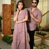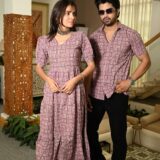 A subtle mauve cotton set featuring abstract block-style line prints. The V-neck puff-sleeve dress and half-sleeve shirt create a modern, casual, and coordinated couple look.