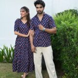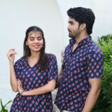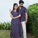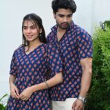 This navy blue matching outfit set includes a women?s midi dress and a men?s short-sleeve shirt, both featuring vibrant red ethnic prints. Perfect for couples who love twinning in style at casual outings, festive gatherings, or vacations.