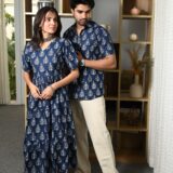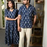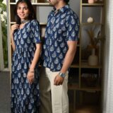 This Navy-Blue Printed couple matching outfit includes a women?s flowy cotton midi dress and a men?s short-sleeve printed shirt. Designed with cheerful yellow floral prints, this set is perfect for summer outings, casual gatherings, or twinning on vacations.