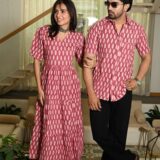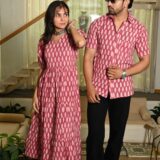 Made from breathable cotton, this matching couple set features a pink base with a classic white handblock leaf print. The women?s puff-sleeve V-neck tiered dress pairs seamlessly with the men?s collared short-sleeve shirt, making it a stylish and comfortable choice for casual outings or festive events.