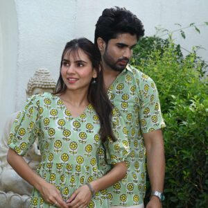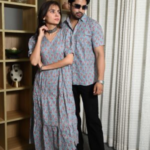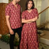 A bold red cotton outfit set featuring traditional floral block prints. The puff-sleeve dress pairs beautifully with the short-sleeve shirt, making it a vibrant and stylish couple ensemble.
