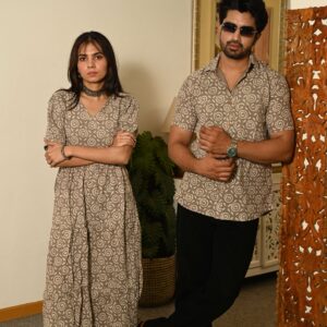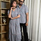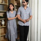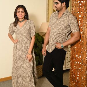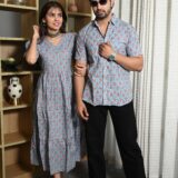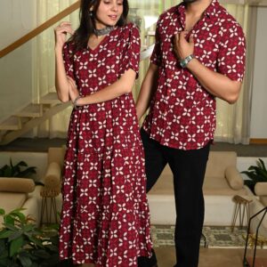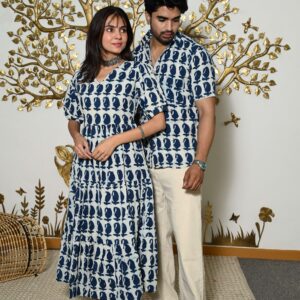 This Sky Blue Printed couple matching outfit includes a women?s flowy cotton midi dress and a men?s short-sleeve printed shirt. Designed with cheerful floral prints, this set is perfect for summer outings, casual gatherings, or twinning on vacations.