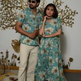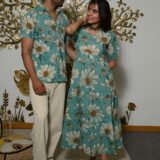 This Teal-Blue floral Printed couple matching outfit includes a women?s flowy cotton midi dress and a men?s short-sleeve printed shirt. Designed with cheerful yellow floral prints, this set is perfect for summer outings, casual gatherings, or twinning on vacations.