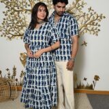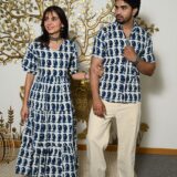 This White And Blue Printed couple matching outfit includes a women?s flowy cotton midi dress and a men?s short-sleeve printed shirt. Designed with cheerful yellow floral prints, this set is perfect for summer outings, casual gatherings, or twinning on vacations.