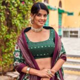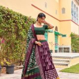 Celebrate festive elegance with this Dark Green Dola Silk Lehenga Choli, paired with a Maroon blouse. Featuring Patola prints with Foil work, tassels, and a 4-meter flair, perfect for weddings, sangeet, and festive celebrations.
