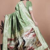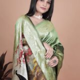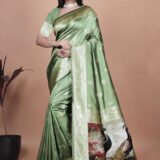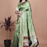 Drape yourself in timeless elegance with this sage green Banarasi silk saree, adorned with delicate golden zari motifs, floral border, and a majestic peacock pallu. Perfect for weddings, festive celebrations, and cultural occasions. Comes with a matching blouse piece.
