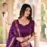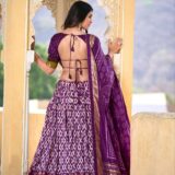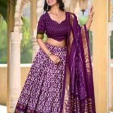 Embrace elegance with this Full Purple Tussar Silk Lehenga Choli, paired with a matching Purple blouse. Featuring Patola prints with Foil work, tassels, and a 3.8-meter flair, perfect for weddings, sangeet, and festive celebrations.