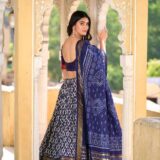 The ensemble includes an unstitched matching Royal Blue blouse with Patola prints, and a 2.4-meter dupatta adorned with matching prints and tassels, blending traditional artistry with contemporary style. The drawstring closure with heavy tassels and zip ensures comfort and a secure fit.