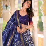 Step into timeless sophistication with this Full Royal Blue Tussar Silk Lehenga Choli, beautifully complemented by a matching Royal Blue Tussar Silk blouse. Crafted from premium Tussar Silk, the lehenga showcases intricate Patola Print work with Foil detailing, stitched with canvas and Can-Can for a voluminous 3.8-meter flair.