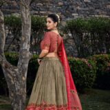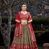 Unleash your inner diva with this Green Tussar Silk Lehenga Choli, paired with a striking Red blouse. Featuring Floral prints with Foil work, tassels, and a 3.8-meter flair, perfect for weddings, sangeet, and festive celebrations.
