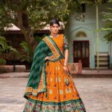 Step into festive charm with this Green Tussar Silk Lehenga Choli, beautifully complemented by a Yellow Tussar Silk blouse. Crafted from premium Tussar Silk, the lehenga showcases intricate Patola Print work with Foil detailing, stitched with canvas and Can-Can for a voluminous 3.8-meter flair.