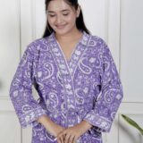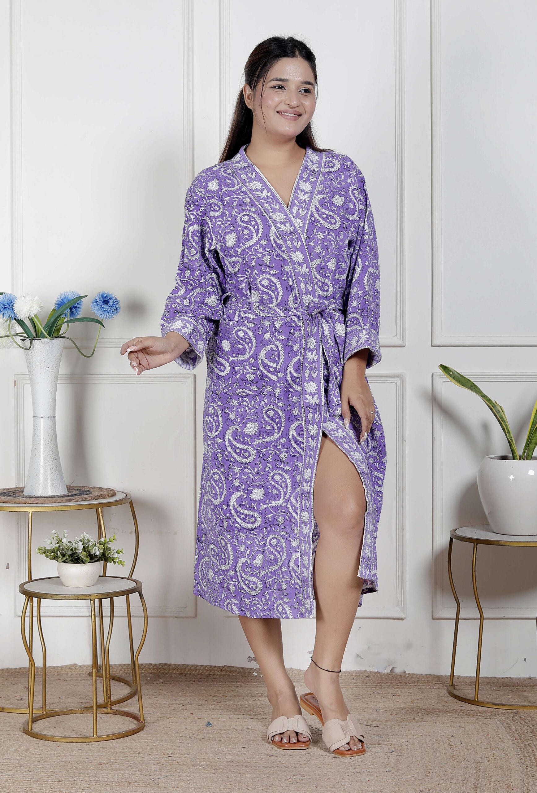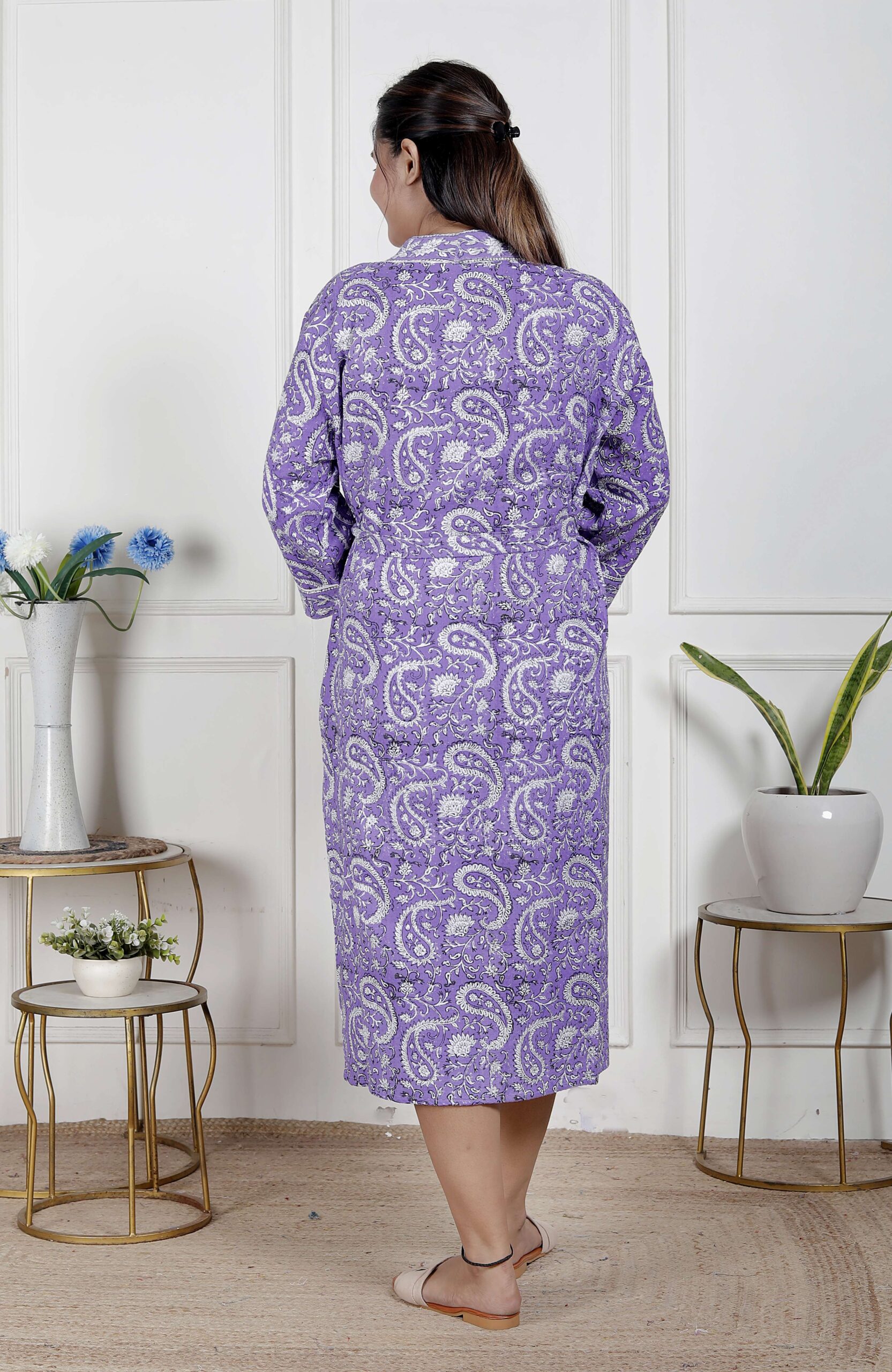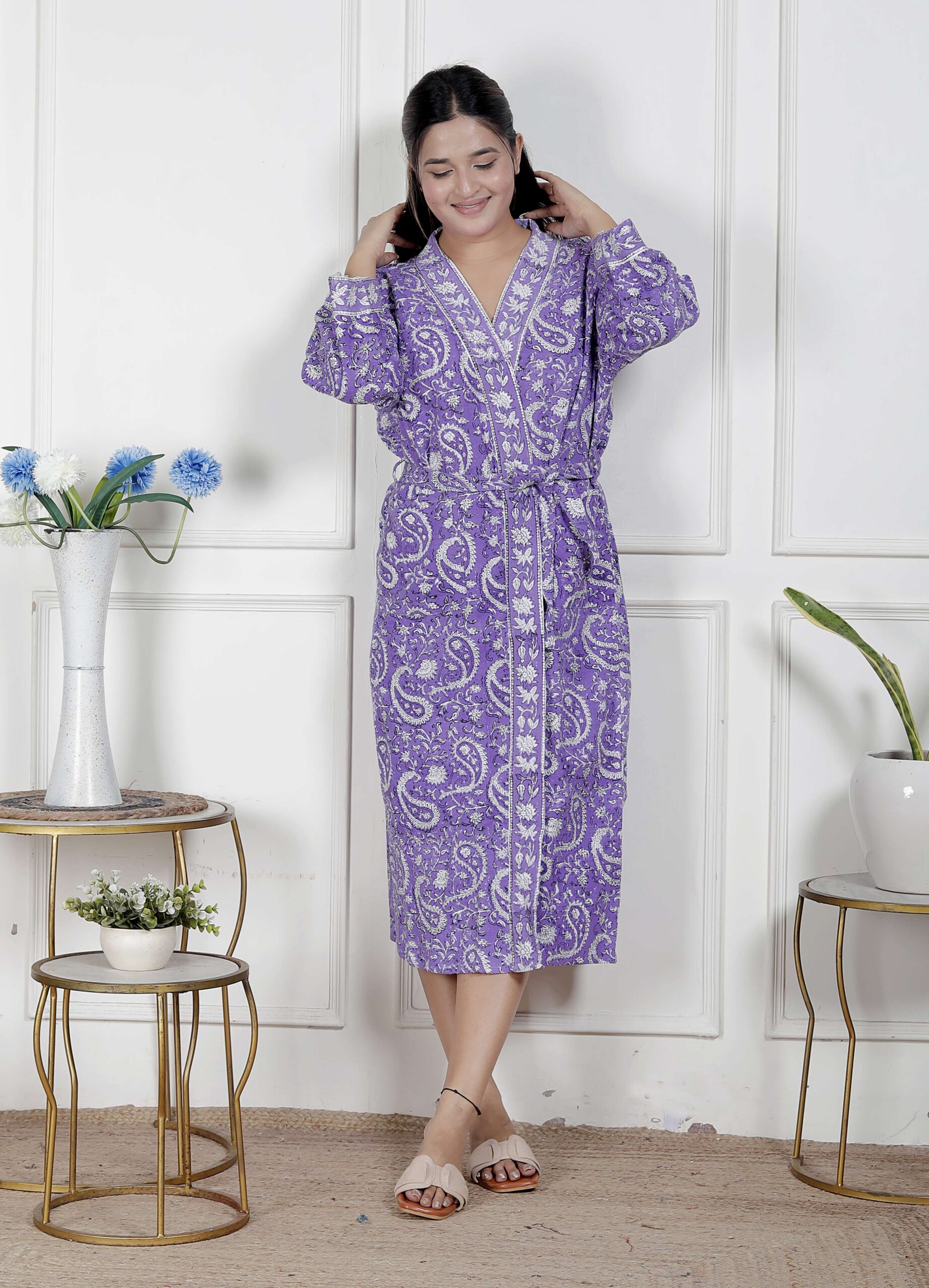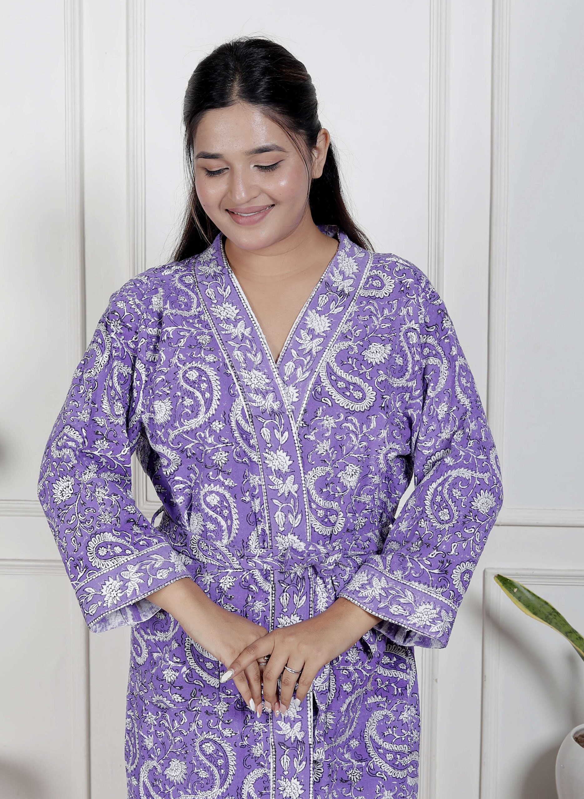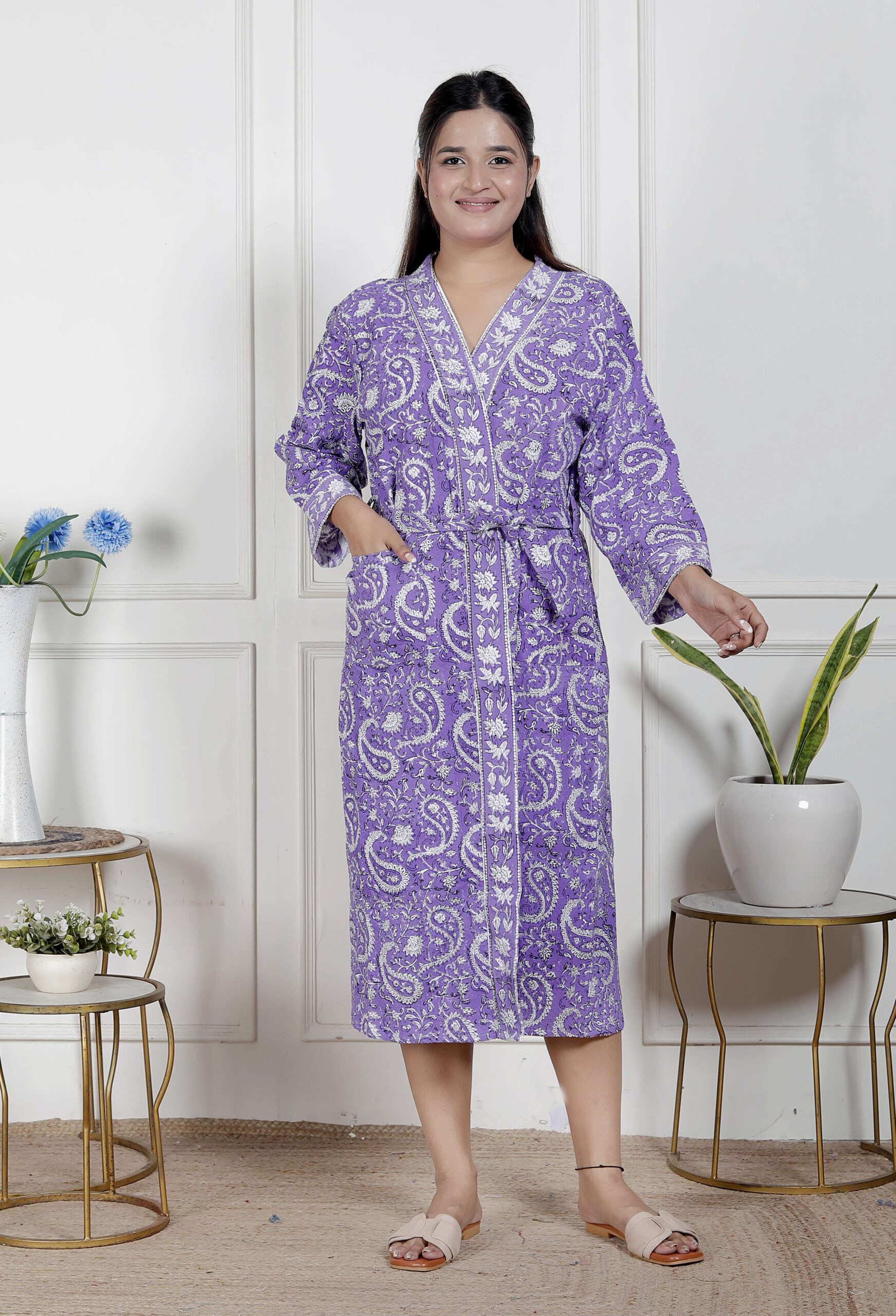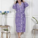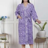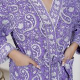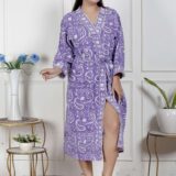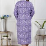 comfort with this elegant cotton bathrobe, crafted from soft and breathable fabric for a relaxed feel. Designed with a stylish print, adjustable waist belt, and convenient length, it ensures ease and comfort for lounging or post-shower wear. Lightweight yet absorbent, this bathrobe combines functionality with modern design, making it a perfect home essential.