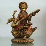 This image depicts MaaSaraswati, the Hindu goddess of knowledge, music, arts, and wisdom. She is seated on a white swan, playing a veena, a stringed instrument. She is adorned with jewelry and draped in white and red.