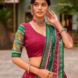 Exude elegance with this Maroon Tussar Silk Lehenga Choli, paired with a Green blouse. Featuring Patola prints with Foil work, tassels, and a 3.8-meter flair, perfect for weddings, sangeet, and festive celebrations.