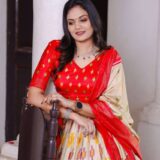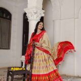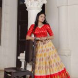 Radiate festive charm with this Scarlet Yellow Dola Silk Lehenga Choli, paired with a bold Red blouse. Featuring Patola print with foil work, Gotta Patti lace borders, tassels, and a 4-meter flair, perfect for weddings, Haldi, sangeet, and festive occasions.