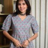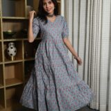 Elevate your everyday look with this Sky Blue Floral Printed Cotton Anarkali Maxi Dress, designed to blend comfort with chic style. Crafted from breathable cotton fabric, this dress features a beautiful all-over floral pattern that adds a touch of charm and femininity. The V-neckline and puff sleeves give it a trendy silhouette, while the flared tiered hemline ensures graceful movement with every step.