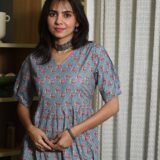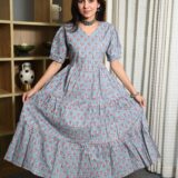 ffortless elegance with this Sky Blue cotton anarkali maxi dress featuring a vibrant floral print, puff sleeves, and a flattering fit-and-flare design. Perfect for casual outings, brunches, and vacation styling.
