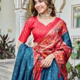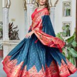 Make a statement with this Teal Blue Dola Silk Lehenga Choli, paired with a bold Red blouse. Featuring Bandhej and Ajarakh prints, Gotta Patti lace borders, tassels, and a 3.8-meter flair, perfect for weddings, receptions, and festive celebrations.