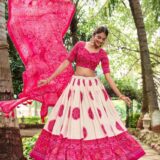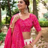 Radiate elegance in this White Dola Silk Lehenga Choli, paired with a charming Pink blouse. Featuring Bandhej and Patola prints, Gotta Patti lace borders, tassels, and a 3.8-meter flair, perfect for weddings, sangeet, and festive occasions.