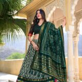 The ensemble includes an unstitched Bottle Green blouse with Patola prints, and a 2.4-meter dupatta adorned with matching prints and tassels, blending traditional artistry with contemporary style. The drawstring closure with heavy tassels and zip ensures comfort and a secure fit.