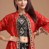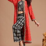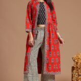 Handcrafted cotton shrug dress set with block prints, featuring a chic crop top, comfy palazzo pants, and an elegant shrug?perfect for festive occasions or casual outings.