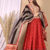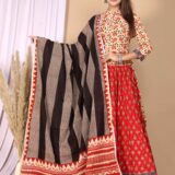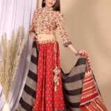 Elegance with this beautifully crafted cotton lehenga set, designed to bring together tradition and modern charm. The blouse features bold zigzag patterns that add a contemporary edge, perfectly paired with a flowy skirt adorned in intricate floral motifs. A matching dupatta with detailed borders completes the ensemble, making it ideal for festive occasions, weddings, or cultural celebrations.
